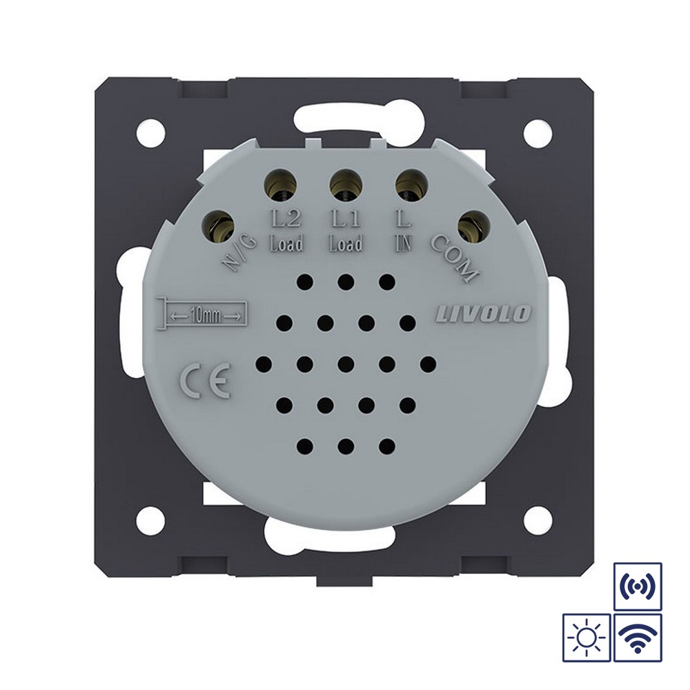 Двухклавишная импульсная сенсорная кнопка Livolo Quadro сухой контакт с функцией радиоуправления, цвет черный (механизм) VL-Q7-02IHR-12