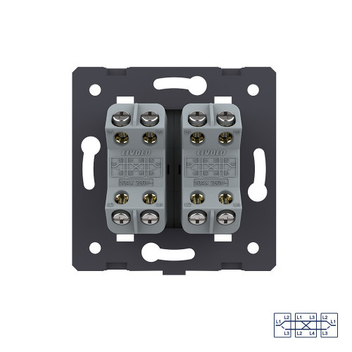 Механизм двухклавишного перекрестного механического выключателя LIVOLO предназначен для управления двумя линиями нагрузки из трех мест. Для управления из трех мест необходимы два проходных выключателя и один перекрестный. В схеме подключения перекрестный выключатель устанавливается между проходными. Поддерживает управление лампами любого типа.