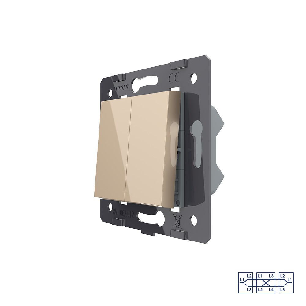 Механизм двухклавишного перекрестного механического выключателя LIVOLO предназначен для управления двумя линиями нагрузки из трех мест. Для управления из трех мест необходимы два проходных выключателя и один перекрестный. В схеме подключения перекрестный выключатель устанавливается между проходными. Поддерживает управление лампами любого типа.