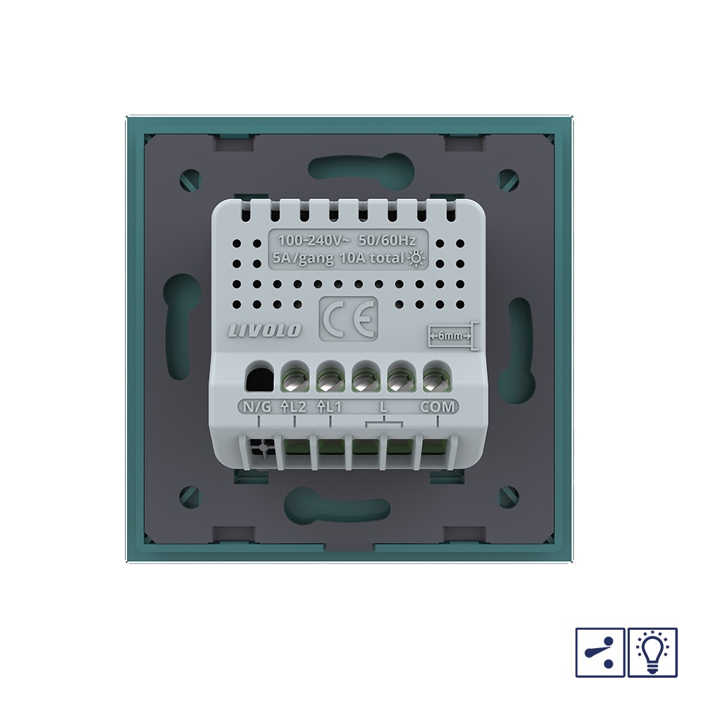 Технические характеристики Двухклавишный проходной/перекрестный сенсорный диммер Livolo, 1 пост, цвет зеленый