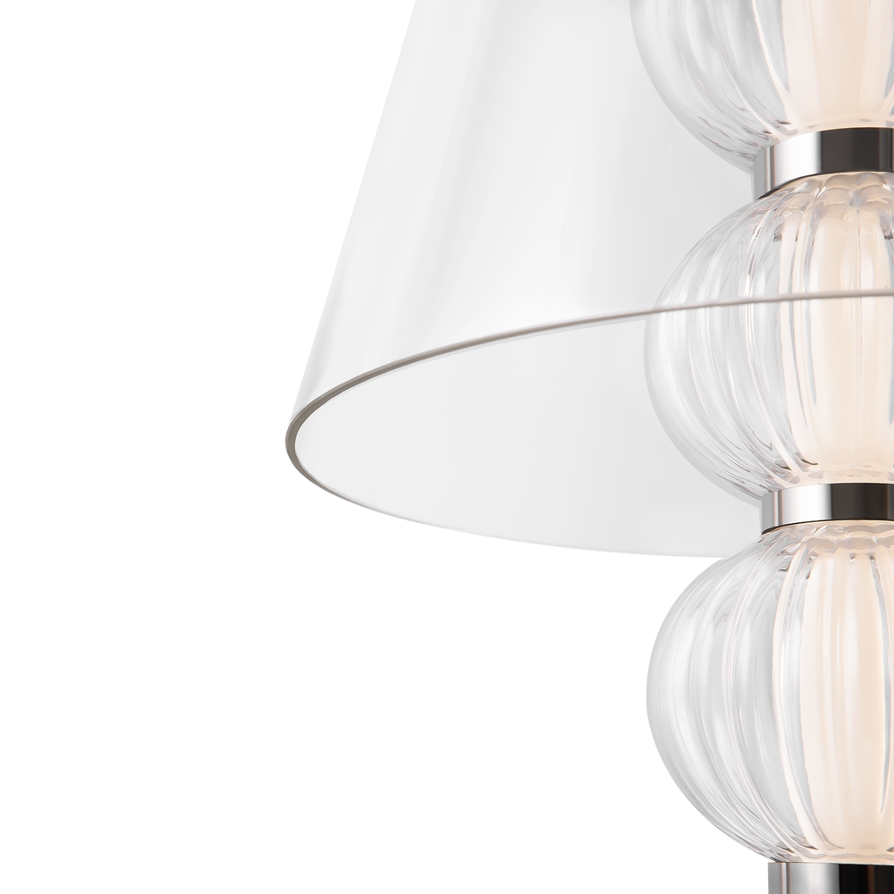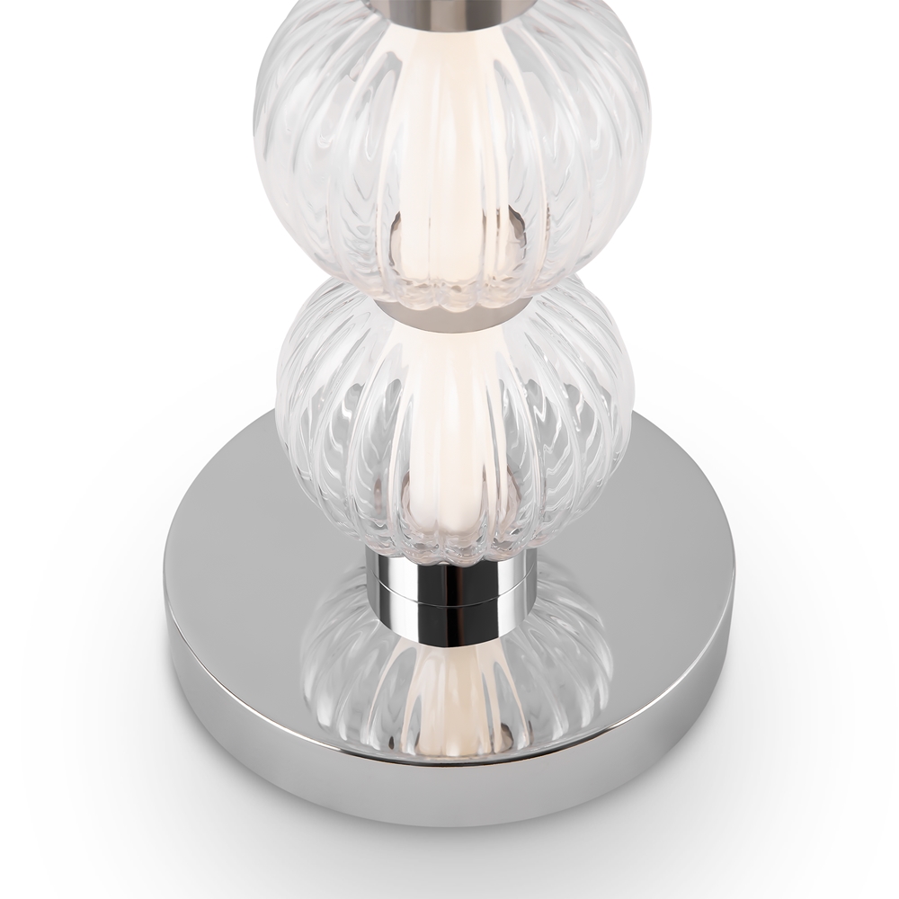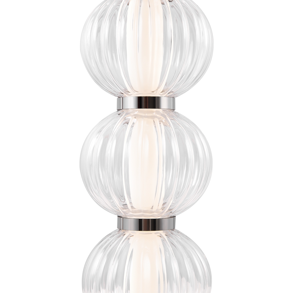 Материал плафона —рельефное стекло, цвет — прозрачный. Материалы арматуры — металл и стекло. Цвет арматуры — хром. Регулируемая высота. Форма плафонов — сфера. Источник света — светодиодная лента, скрытая под акриловым