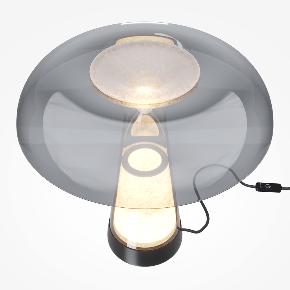 Серия Artefact обращается к наследию античного мира, словно оживляя находки археологических раскопок в современном интерьере. Дизайн настольного светильника строится на контрасте естественного белого цвета алебастра – исторического артефакта – и скрывающего его серого тонированного стекла. Таким образом настольный светильник обладает эффектом музейного экспоната, наделённого функциональностью.