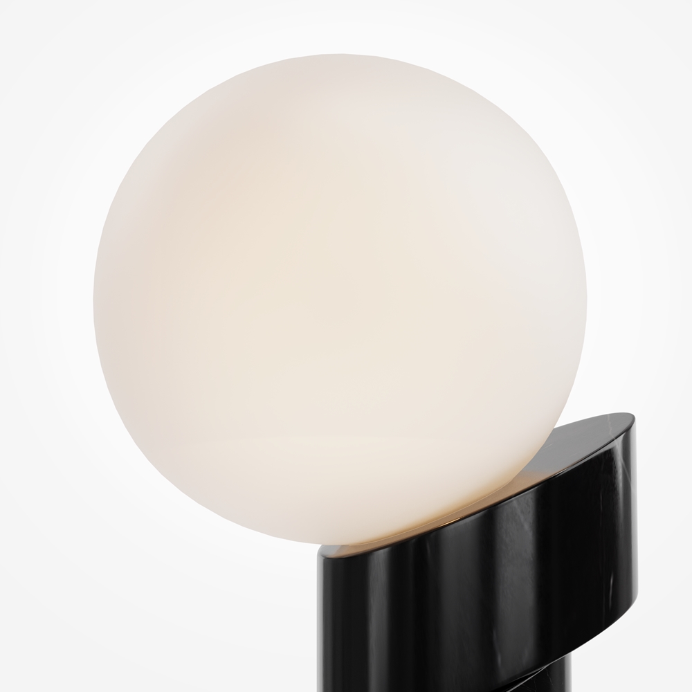 Асимметричный разрез не только определяет уникальный характер светильника, но и выполняет практическую функцию, открывая доступ к сенсорному выключателю с функцией диммирования. Мягкое, комфортное освещение создаётся LED-источником (3000К), скрытым за матовым стеклянным плафоном-шаром, который обеспечивает равномерное рассеянное свечение, наполняющее пространство уютом. Устойчивость и статусность конструкции придаёт массивное основание из натурального чёрного мрамора с уникальным рисунком — этот благородный материал гарантирует надёжность и подчёркивает монументальность формы.