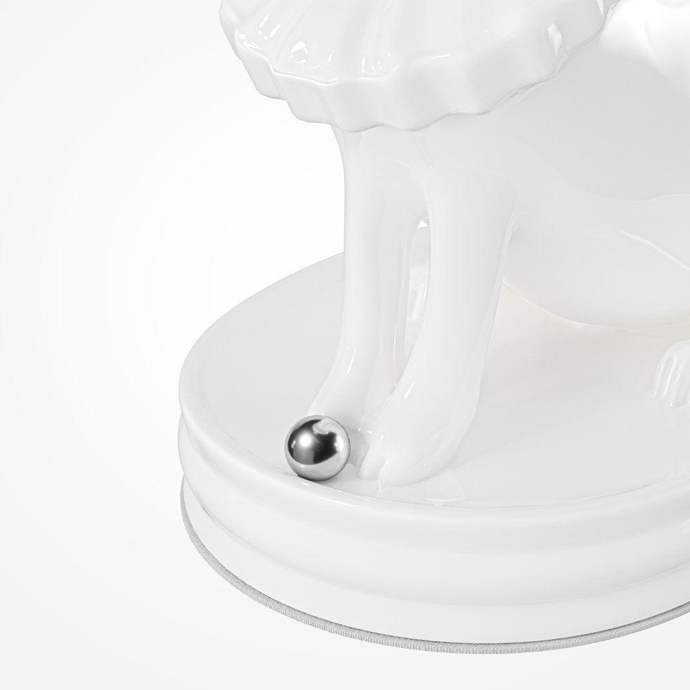 Фигурка капибары из натуральной керамики с молочно-белой глянцевой глазурью бережно держит тактильный металлический шарик — сенсорный выключатель. При касании шарика на голове животного загорается рельефный плафон из белого глянцевого стекла, мягко рассеивающий тёплый свет LED-источника (3000К). Яркость свечения регулируется касанием сенсорного шарика на основании. Особое внимание к деталям подчёркивает два варианта покрытия шарика — в цвете сатинированной латуни или глянцевой платины, что позволяет точно вписать светильник в цветовую гамму интерьера.