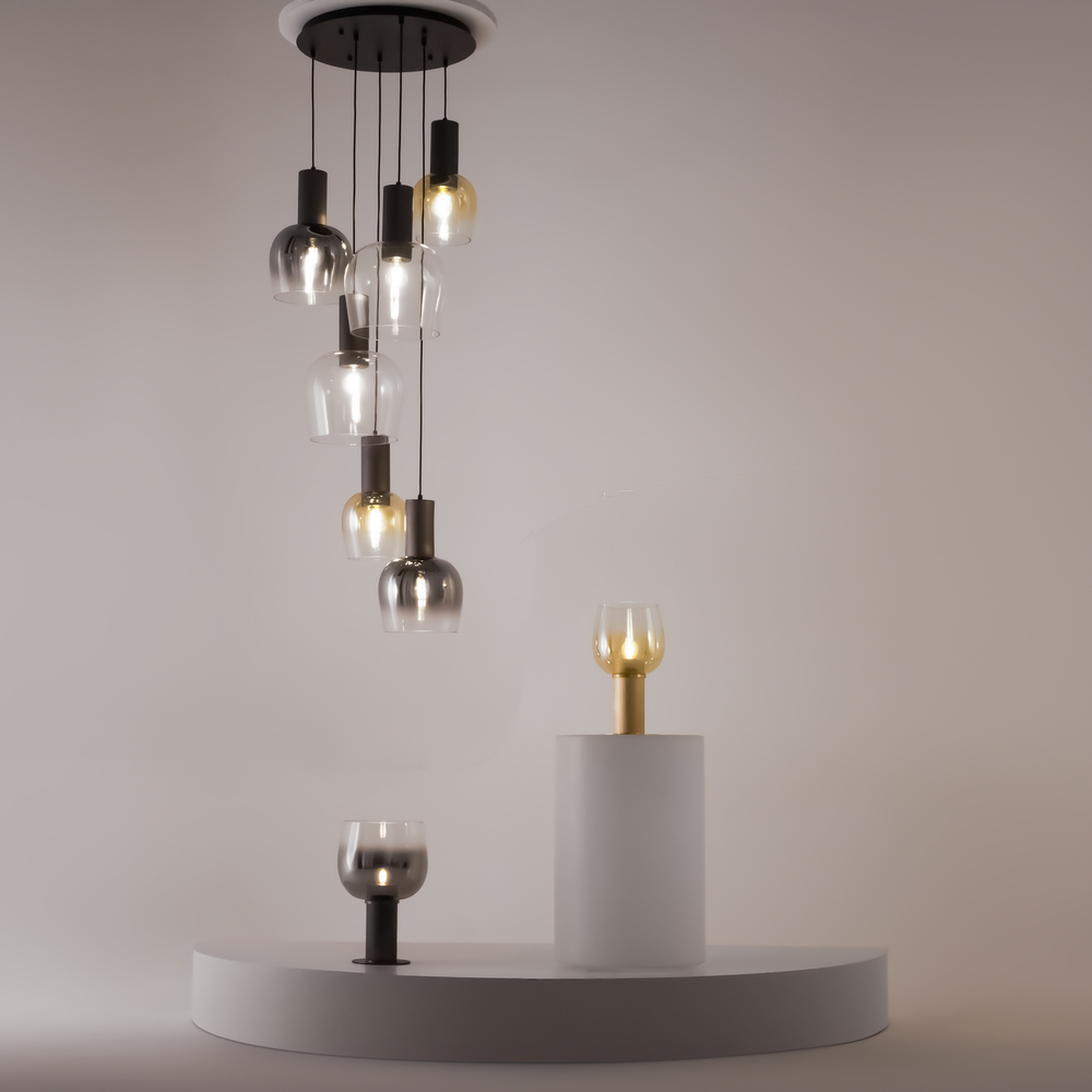 Объемные плафоны из выдувного стекла с градиентным окрашиванием станут акцентным декоративным элементом в интерьере. Дымчато-серый или насыщенно-янтарный цвета переходят в почти прозрачный – такое решение создает воздушный парящий эффект. Арматура может иметь цвет глянцевого золота или черное покрытие с антибликовым эффектом. Сочетание плафонов разных диаметров оригинально смотрится в каскадной композиции.