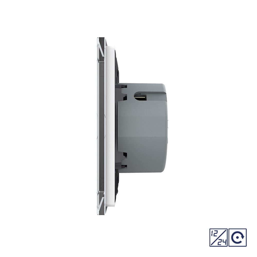 Устанавливается в круглый подрозетник в комплекте со стеклянной лицевой панелью (в комплекте).