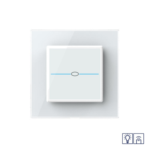 Одноклавишный сенсорный диммер с функцией радиоуправления со стеклянной рамкой LIVOLO Quadro предназначен для регулировки яркости диммируемых ламп одной линии нагрузки с помощью пульта ДУ.