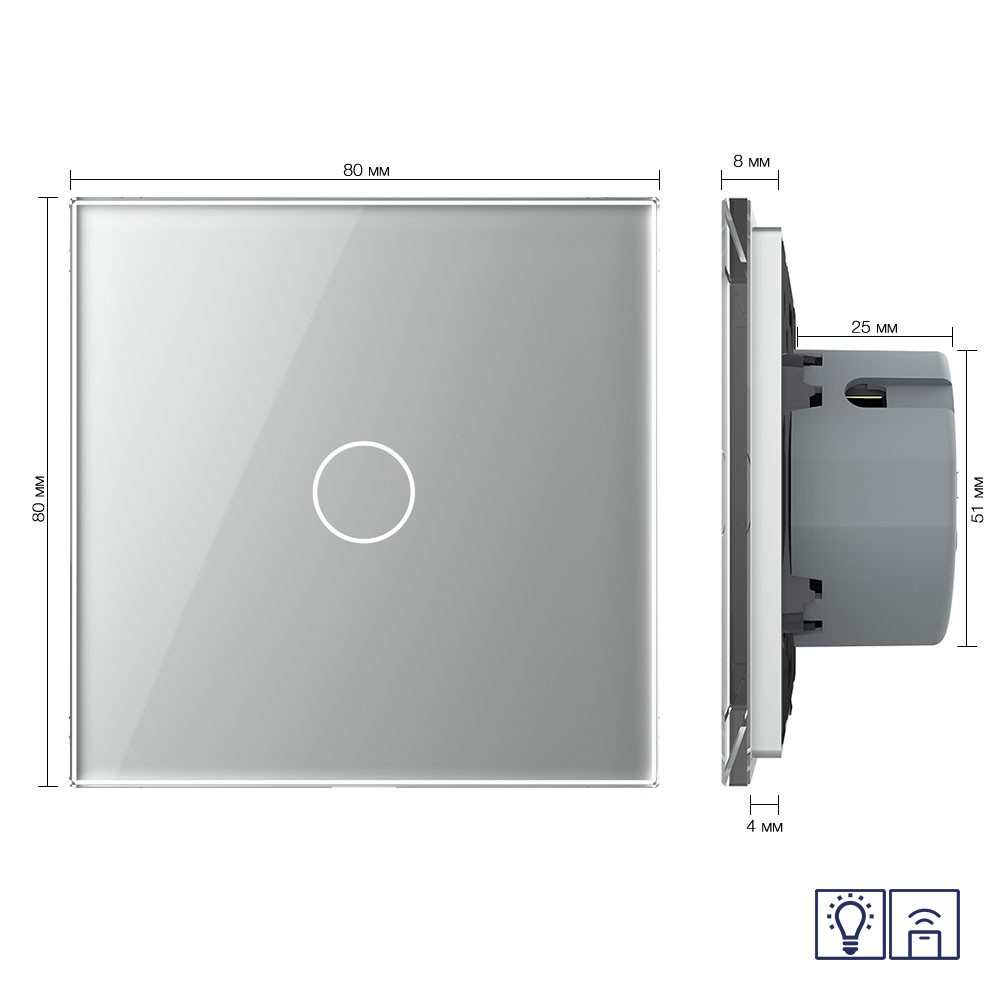 Одноклавишный сенсорный диммер с функцией радиоуправления со стеклянной лицевой панелью LIVOLO предназначен для регулировки яркости диммируемых ламп одной линии нагрузки с помощью пульта ДУ.