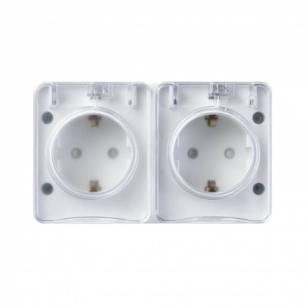 Розетка имеет степень защиты IP54, которая надежно защищает контакты от пыли и брызг воды. Ударопрочный корпус IK08 устойчив к механическим воздействиям, а УФ-стойкий пластик сохраняет белый цвет и аккуратный внешний вид даже при длительной эксплуатации.
