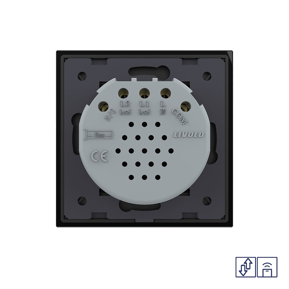 Сенсорный выключатель для штор с функцией радиоуправления со стеклянной рамкой LIVOLO Quadro используется для управления двигателями с подачей питания 220В с помощью пульта ДУ. Работает в режиме открыть/закрыть. Выключатель с сухим контактом.