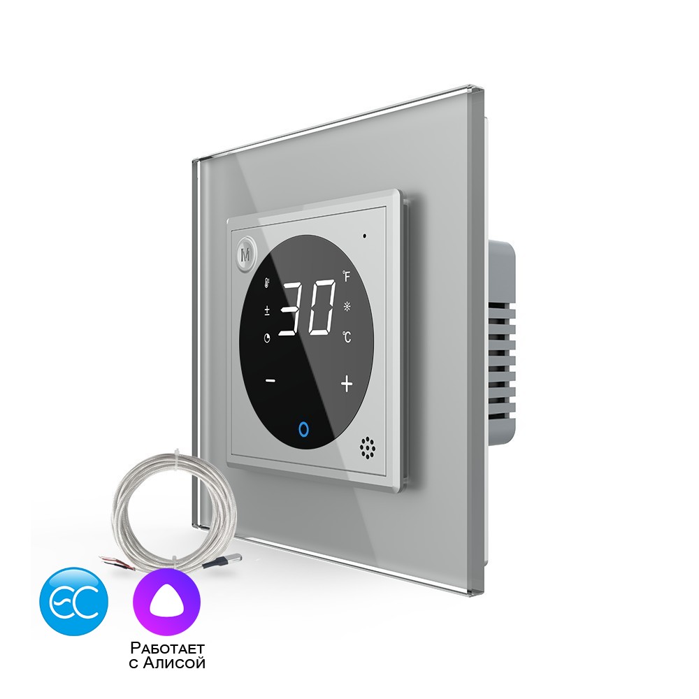 Умный терморегулятор пола Livolo EC 16А, сенсорное управление, датчик воздуха, датчик пола 5 метров LIVOLO предназначен для контроля и поддержания заданного значения температуры нагрева воздуха в помещении и ее регулировки, при изменении внешних условий поддержкой дистанционного управления по протоколу EC через мобильное приложение LIVOLO HOME. Приложение LIVOLO HOME доступно для iOS в App Store и Android в Google Play. Cенсорный терморегулятор с лаконичным и современным дизайном. Терморегулятор имеет встроенный датчик температуры воздуха и имеет два режима работы - контроль температуры и времени работы.